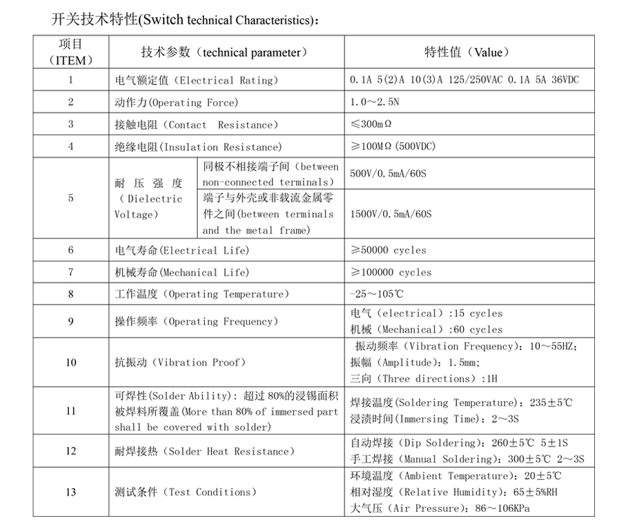 | 1 | Elektrische beoordeling | 0,1A 5(2)A 10(3)A 125/250VAC 0,1A 5A 36VDC | |