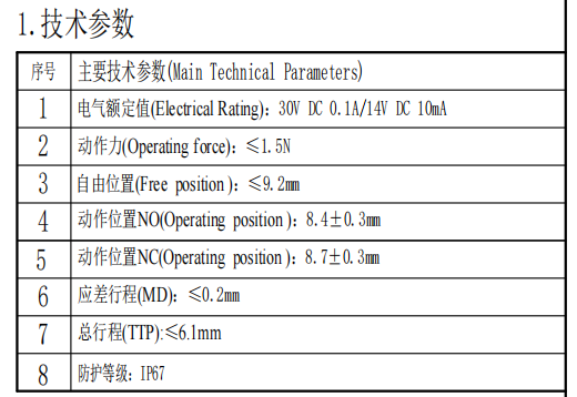 | 1 | Elektrische beoordeling | 10MA 14V DC/0.1A 30VDC | |